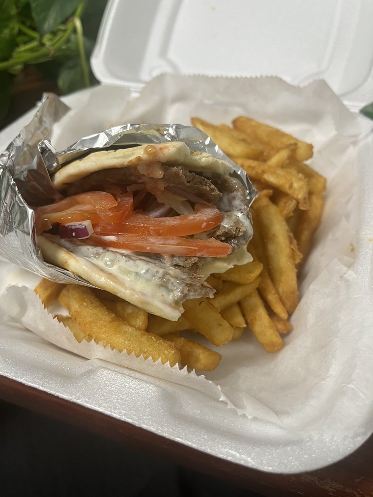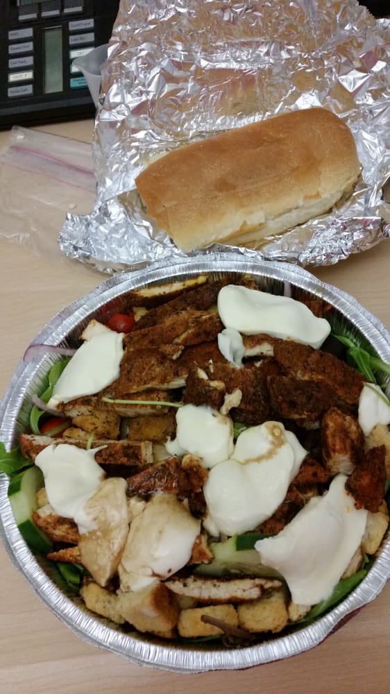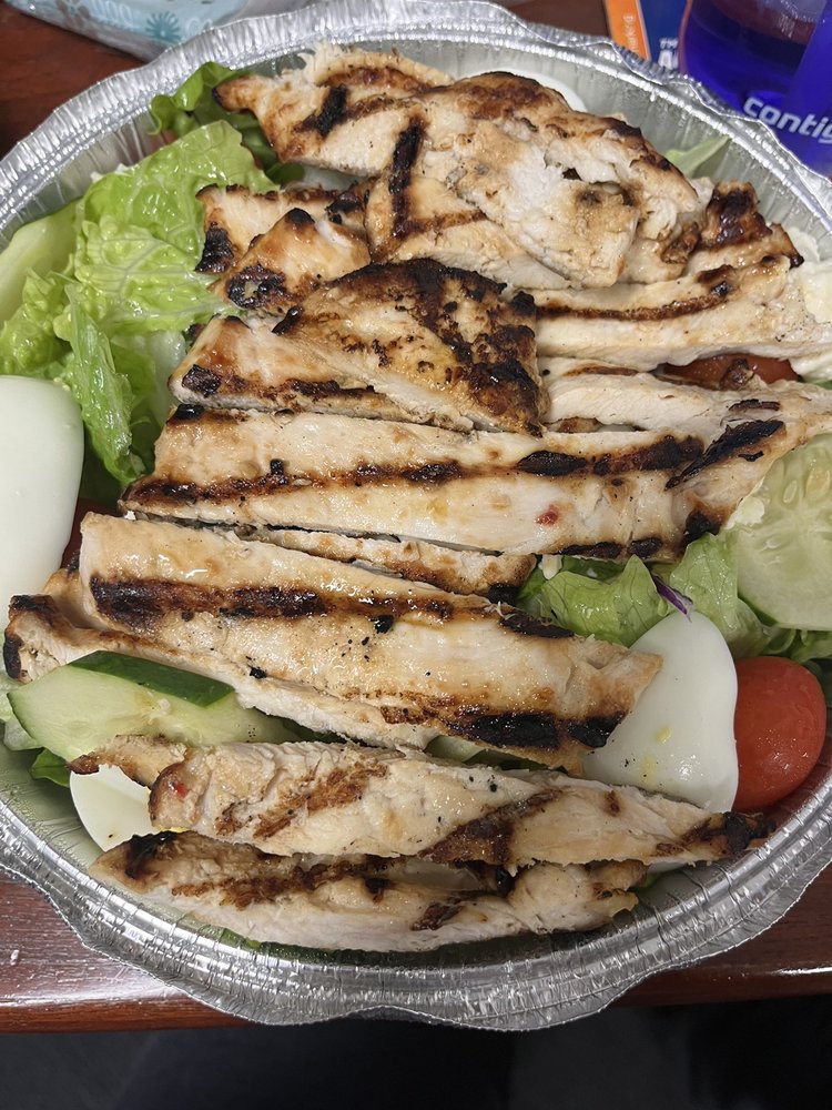 Mixed greens of lettuce, cherry tomatoes, cucumber, black olives, bell peppers, mozzarella cheese, hard-boiled egg slices, and generous portions of crispy chicken. If you like it with some kick, make it the buffalo.