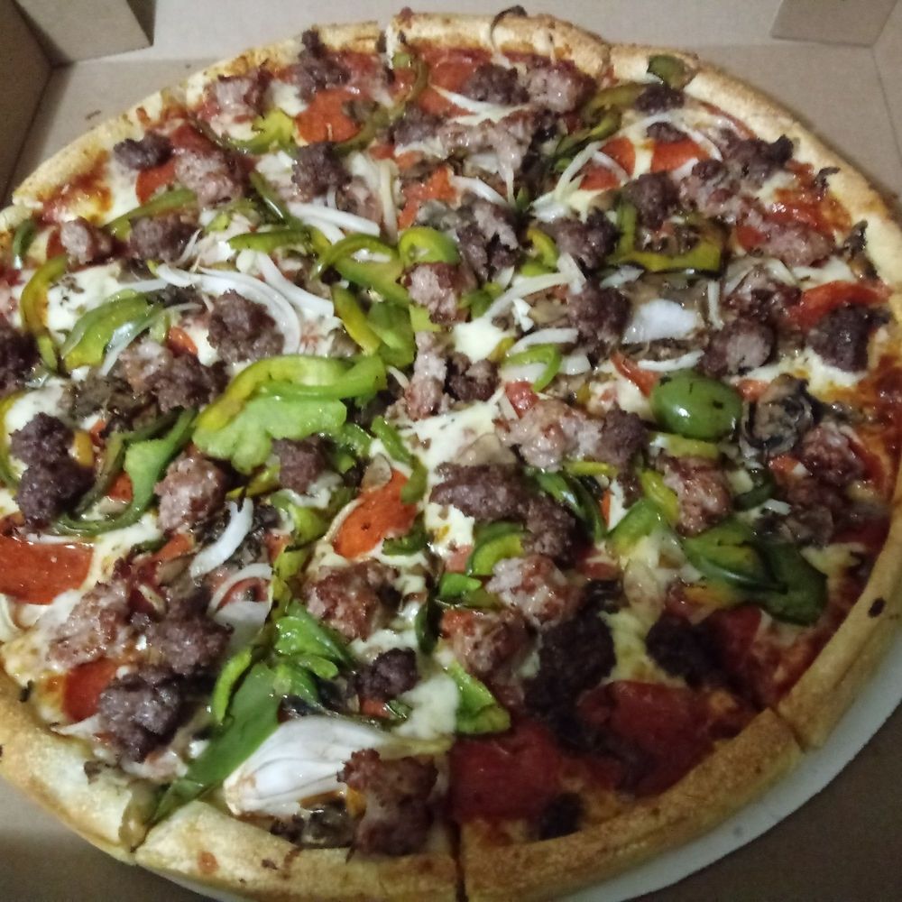 A red pizza topped with pepperoni, onions, mushrooms, bell peppers, hamburger, sausage and anchovies upon request.